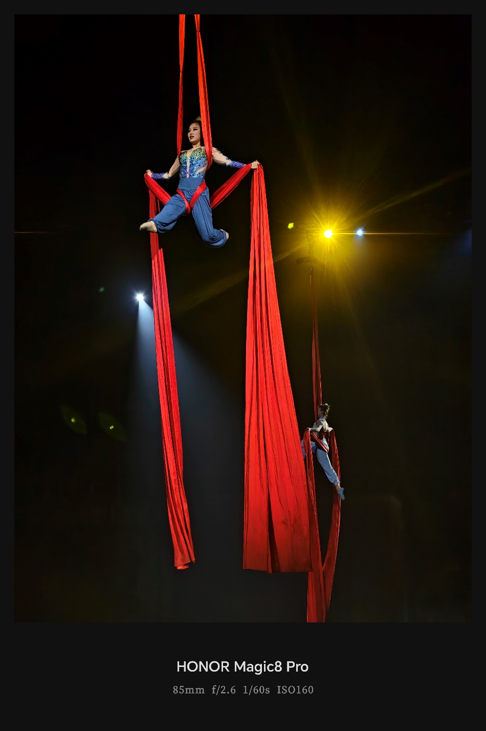 无论是拍摄空中杂技演员的动态瞬间,还是记录火秀表演明暗交织的复杂光影,即使在手持拍摄的情况下,也能保证画面的极致清晰与稳定。而AiMAGE·人像引擎则让嘉宾们在夜色中拍摄的人像作品,也能有大师级的质感与氛围。